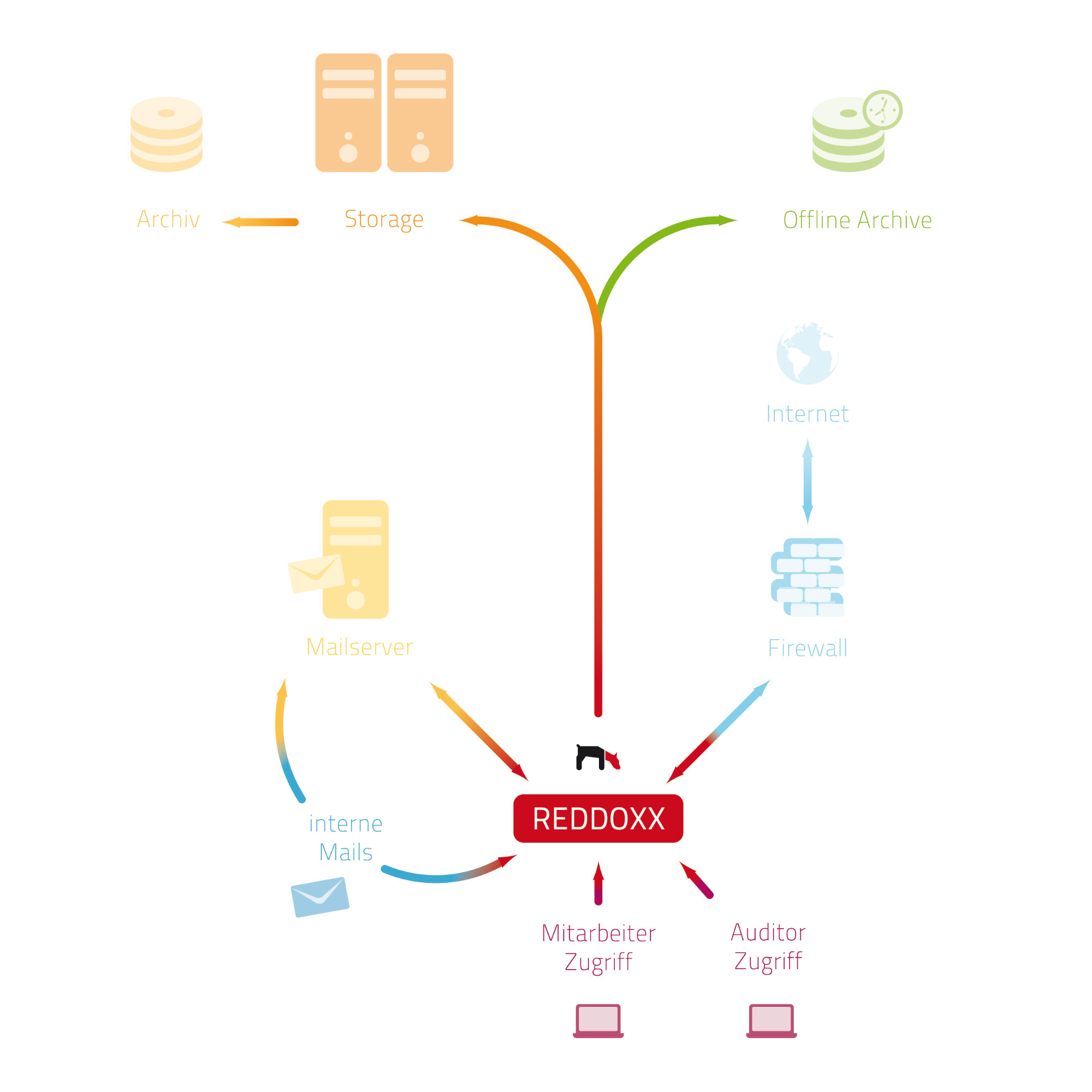 REDDOXX MailDepot archiviert alle ein- und ausgehenden E-Mails vollautomatisch und kann durch die Unterstützung verschiedenster Mailserver problemlos in jede bestehende Infrastruktur eingebunden werden, um auch die internen E-Mails zu archivieren.